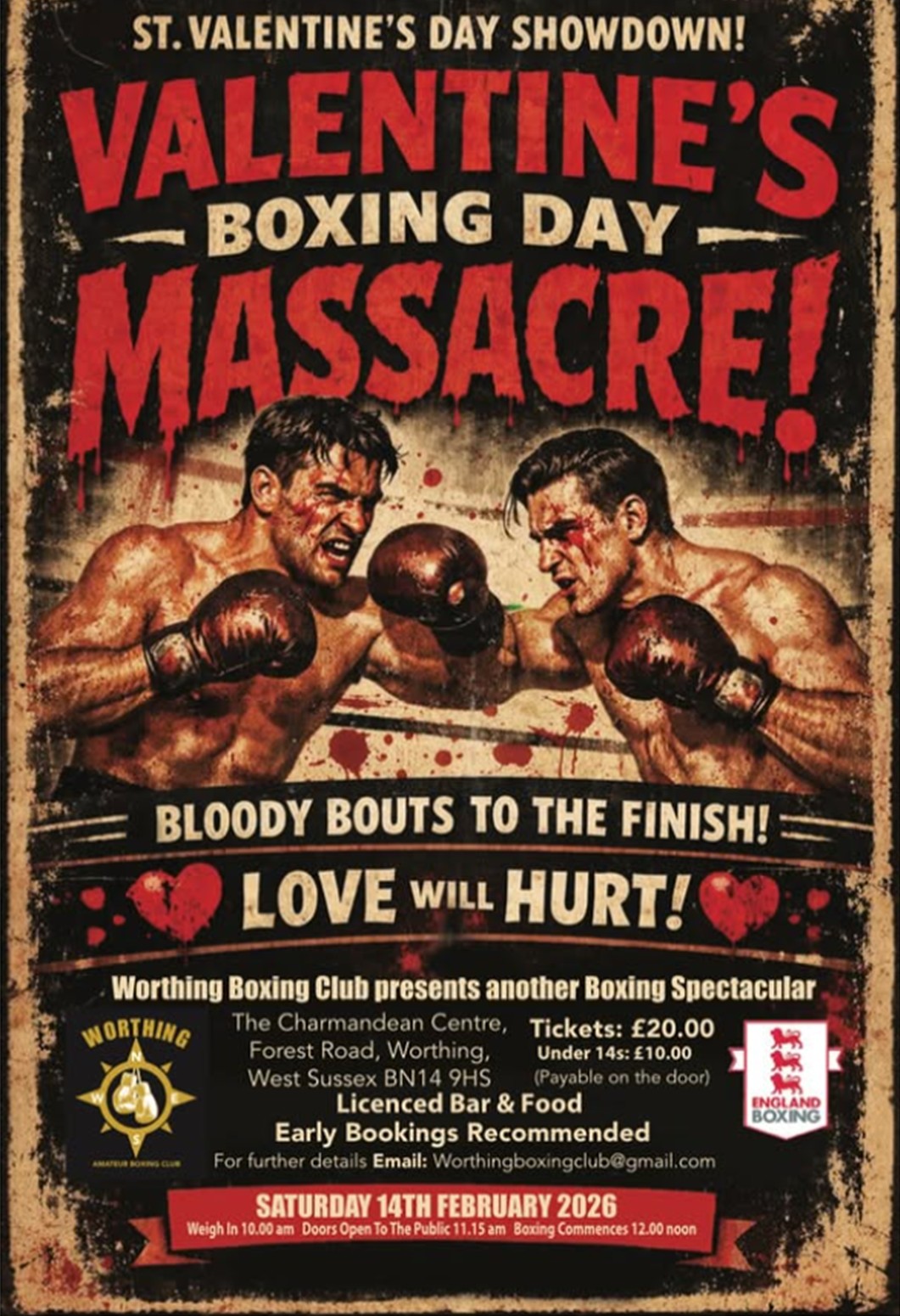 « All Events Worthing Boxing Club – 14th February February 14 @ 11:30 am - 5:00 pm « Laurence Penn 29th Jan Wrestling 15th February » Facebook Twitter LinkedIn + Google Calendar+ iCal Export Details Date: February 14 Time: 11:30 am - 5:00 pm